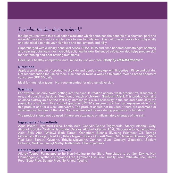 • WHAT IT DOES: Contains 10% AHAs + PHAs, merging the benefits of a chemical peel and microdermabrasion into one easy-to-use formulation. innovative formula combines traditional dermatologist remedies with the latest skincare science to significantly improve the appearance of dry, rough, bumpy skin and keratosis pilaris (chicken skin).Your new go-to body scrub: Smooths razor or shaving bumps, frees ingrown hairs, improves body discoloration (like dark knees or elbows), reduces back acne, decongests pores, removes impurities, and is perfect for self-tanner preparation or removal.