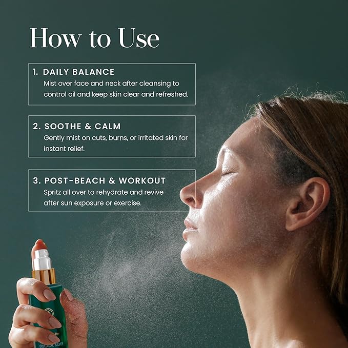 • 🌿 Multi-Purpose Toner: Calm, soothe, and hydrate acne-prone and inflamed skin with our versatile Colloidal Silver Mist Toner. Suitable for face, body, and even after waxing to reduce irritations.