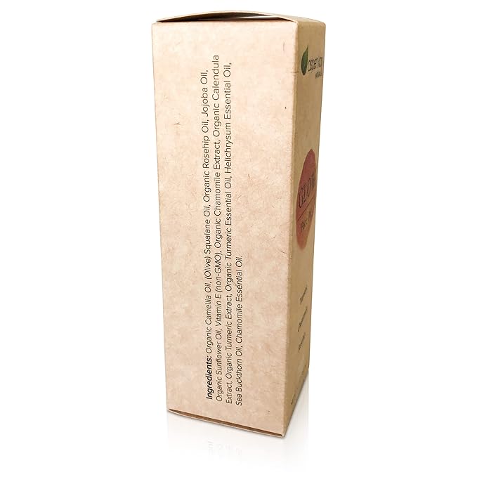 • WITH ORGANIC ROSEHIP SEED OIL AND ORGANIC TURMERIC OIL Made with organic unrefined Rosehip seed oil, organic camellia seed oil, organic turmeric essential oil, organic chamomile, organic calendula, Sea buckthorn oil, Jojoba oil and Helichrysum essential oil