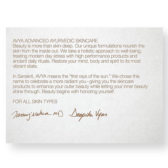 • AVYA Advanced Ayurvedics is Inspired by Nature & Perfected by Science. Using all natrual ingredients and innovative laboratory technology to deliver medical-grade results for a more golden you.