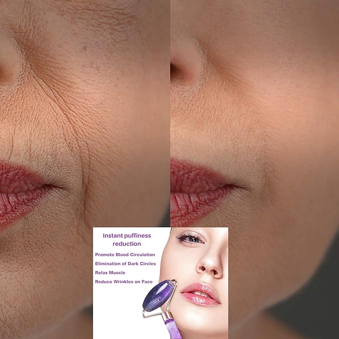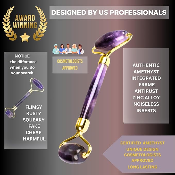 • Bonus Amethyst Guasha & Jade Roller - Noisless & Smooth USA Quality : We’ve seen those Jade Rollers too, you know the ones that squeak and break. This, is not those.But we use a hard, stainless steel integrated frame (all one piece) and two tiny “wheels” that we insert in the head of the roller which turns your roller smoothly and without a noice..