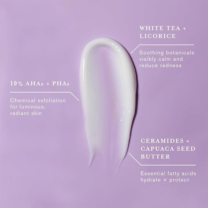 • FEATURED INGREDIENTS: Glycolic + Lactic Acids – Potent AHAs that exfoliate for smoother, softer skin. Ceramides – Prevent moisture loss and support a healthy skin barrier. Urea – Draws moisture from the air to hydrate skin. Gluconolactone – PHA that exfoliates, hydrates, and offers anti-aging benefits. Lactobionic Acid – A gentle PHA for hydration and exfoliation. Squalane – Restores and hydrates. Cupuacu Seed Butter – Moisturizes and protects with polyphenols. Anti-Redness Complex – Reduces redness and calms skin. Willow Bark – Exfoliates deeply as a natural BHA.
