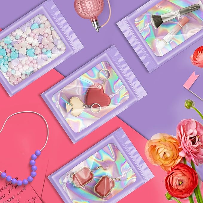 100 Pieces Smell Proof Mylar Bags, Holographic Packaging Bags, Resealable Odor Foil Pouch Zipper Bag with Clear Window for Food Storage and Lipgloss, Jewelry Lash (Purple, 3 x 4.7 Inch)