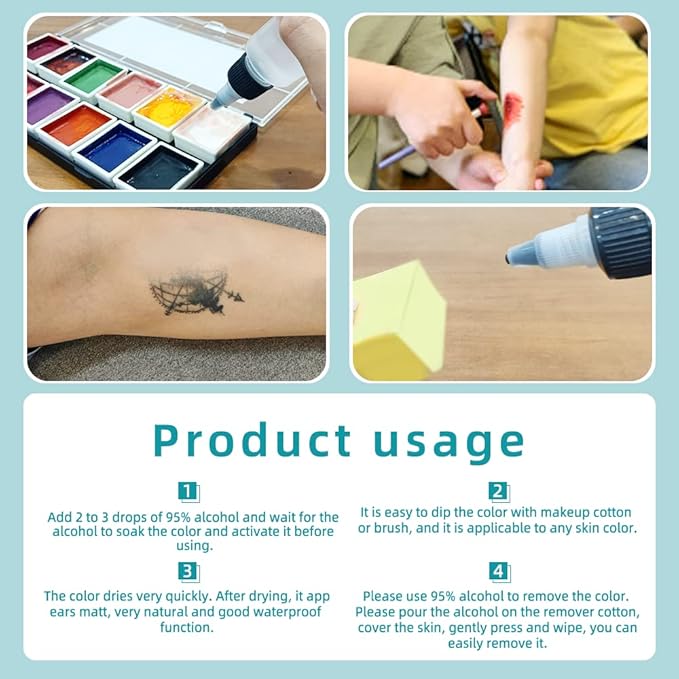 • 【Application】It can be used for special effect makeup, tattoo coverage, FX prosthesis, and it is very easy to master whether it is a performing arts worker or a makeup beginner. You only need to drop a few drops of alcohol in the paint grid before each use and wait for it to soak in, then you can paint with a paintbrush or cotton pad. After it dries, it will not fall off easily whether it is washed with water or sweated, so even in the Acrobats or action actors in the water can be used.