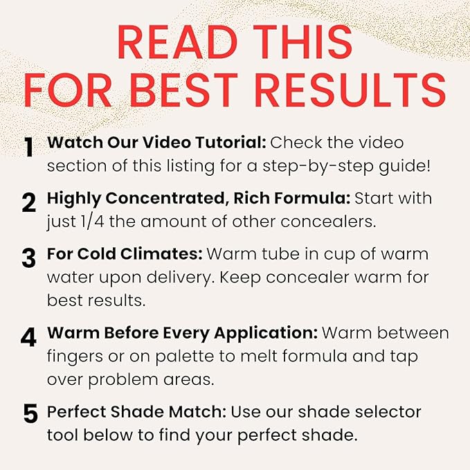 • Read This For Best Results: Use just 1/4 the amount of typical concealers; warm on fingers/palette until it melts for flawless application; find your perfect shade with our shade selector tool below; for cold climates to keep product warm before use; and check our video section for a detailed tutorial.