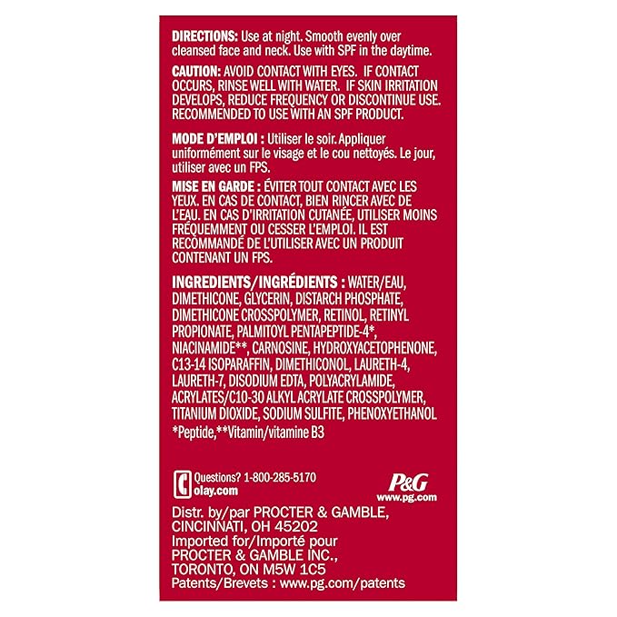 • POWERFUL ANTI-AGING INGREDIENTS: Formulated to deliver Olay's Proprietary Retinol Complex, along with Niacinamide, dermatologist-recommended Peptides, and Glycerin, deep into skin's surface for smooth & supple skin.