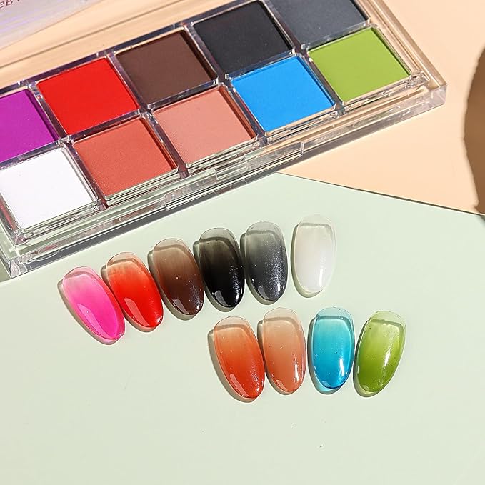 • 【YOU WILL GET】 10 colors in one palette solid nail powder and 10 doubled-head sponge sticks for rubbing nail pigment.