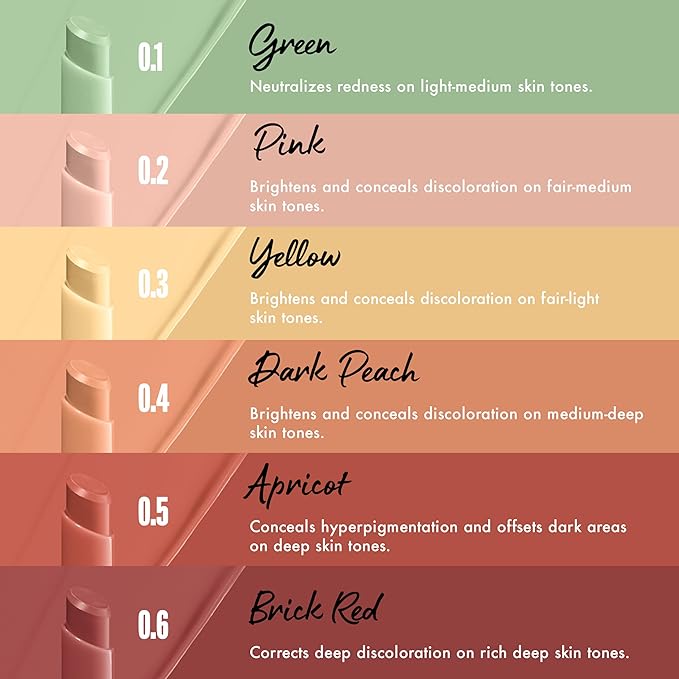 • Color Correcting Made Easy: Our 6 color correcting concealer shades for all skin tones and 18 complexion concealer stick shades help conceal & brighten like a pro. Fix dullness, redness, blemishes, dark spots, undereye circles, and discoloration