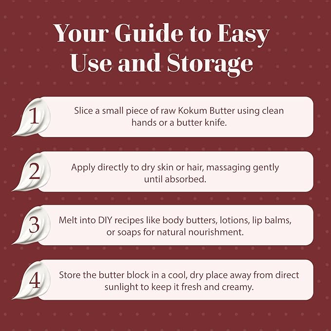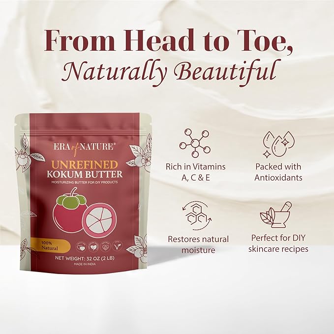 • RAW AND UNREFINED KOKUM BUTTER: era of nature kokum butter is 100% pure, firm, and scent-free—ideal for blending with raw shea butter or cocoa butter. A favorite for those creating belly butters, stretch mark creams, and deeply moisturizing body products.