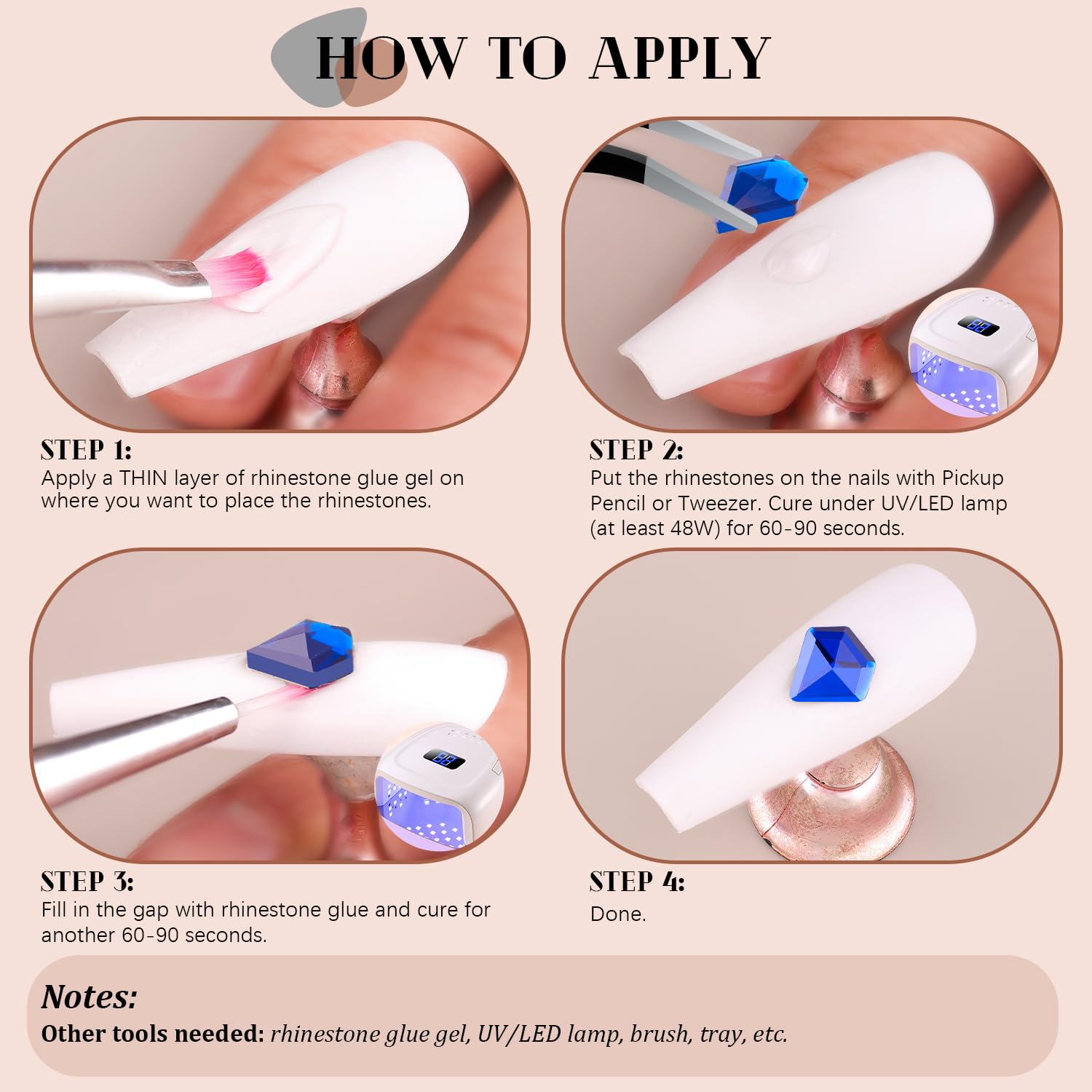 • đź’ŽEASY TO USE -- Easy to apply on artificial nails. After applying nail polish and applying enough gel on the nails, simply use the equipped tools (pickup pen + tweezers) to pick up the crystals onto your nails to create your fabulous DIY designs! These crystals gemstones are different from those hotfix stones, they are not self-adhesive, you have to apply glue to stick them (glue is not included.)
