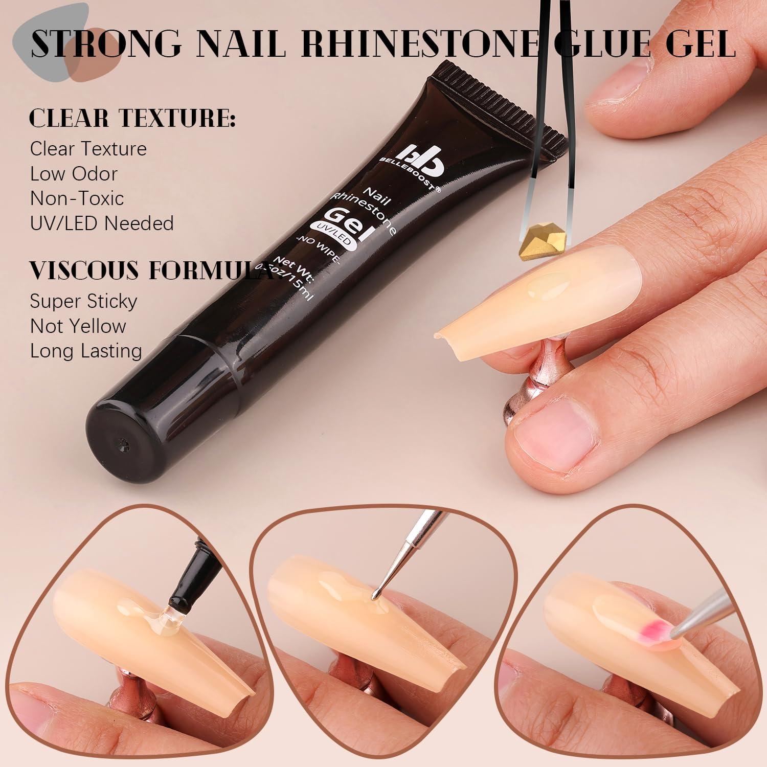 • đź’ŽADHESIVE GEL GLUE: The rhinestones glue gel uses a special, non-toxic and eco-friendly formula with strong tackiness, adhesion, and fluidity for easily applying decorations. It is a type of UV gel glue. After proper curing under a UV/LED lamp, the glue dries clear with superior bonding strength that can last a few weeks without falling off. With the designed tip, you can easily and conveniently apply the glue to the nail bed or the surface of false nails.