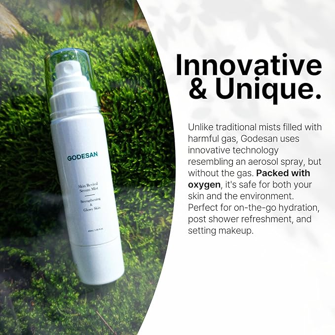 • 🌲Non-aerosol Mist🌲It functions like an aerosol spray, but it has been developed and designed with innovative technology to be non-aerosol. Traditional aerosols contain gas, which can be an irritant. Godesan Serum Mist is filled with pure oxygen, making it safe for use on skin and eco-friendly.