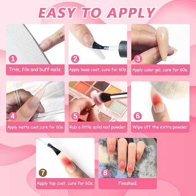 • 【Easy To Use】To get the best nail effect,need to apply base coat and no wipe top coat, cured via a UV LED lamp, before applying the powder. Rub with a sponge stick or a ombre nail brush will be easier to get amazing effect.