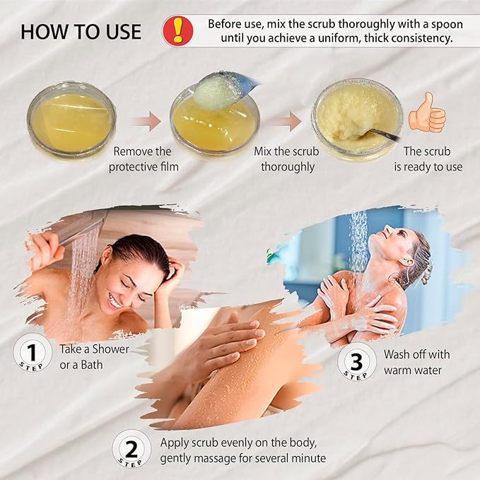 • How to use - before using the scrub, thoroughly mix it to ensure even distribution of the oil and exfoliating particles. Wet your skin with warm water to open the pores, then apply the scrub to damp skin, gently massaging in circular motions. Rinse with warm water and pat your skin dry with a towel. Allow the remaining oil to absorb, avoiding additional moisturizing. This will maximize the effect of the treatment, leaving your skin soft and hydrated.