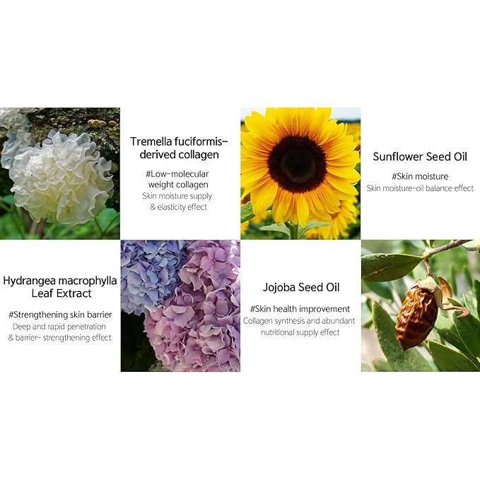 • Active Ingredients : Artemisia Princeps Leaf Water, Cetyl Ethylhexanoate, Butylene Glycol, Caprylic/Capric Triglyceride, Olea Europaea (Olive) Fruit Oil, Glycerin, Niacinamide, 1,2-Hexanediol, Water, Sodium Chloride, Propanediol, Hydroxyacetophenone, Hippophae Rhamnoides Fruit Oil, Adenosine, Ethylhexylglycerin, Zea Mays (Corn) Kernel Extract, Disodium EDTA, Hyaluronic Acid, Hydrolyzed Hyaluronic Acid, Sodium Hyaluronate, Citrus Unshiu Fruit Oil, Fructan, Citrus Junos Seed Extract, Glucose, Hippophae Rhamnoides Fruit Extract, Myrciaria Dubia Fruit Extract, Rumex Crispus Root Extract, Hippophae Rhamnoides Oil, Centella Asiatica Extract, Fragrance, Artemisia Princeps Leaf Water, Cetyl Ethylhexanoate, Butylene Glycol, Hydrogenated Polyisobutene, Niacinamide, Glycerin, 1,2-Hexanediol, Sodium Chloride, Water, Limnanthes Alba (Meadowfoam) Seed Oil, Propanediol, Hydroxyacetophenone, Adenosine, Ethylhexylglycerin, Melia Azadirachta Leaf Extract, Zea Mays (Com) Kernel Extract, Melia Azadirachta Flower Extract, Disodium EDTA, Coccinia Indica Fruit Extract, Hyaluronic Acid, Hydrolyzed Hyaluronic Acid, Sodium Hyaluronate, Amber Powder, Solanum Melongena (Eggplant) Fruit Extract, Oenothera Biennis (Evening Primrose) Oil, Curcuma Longa (Turmeric) Root Extract, Ocimum Sanctum Leaf Extract, Artemisia Princeps Leaf Extract, Corallina Officinalis Extract, Moringa Oleifera Seed Oil, Fructan, Glucose, Chamaecyparis Obtusa Leaf Extract, Centela Asiatica Extract, Fragrance, Artemisia Princeps Leaf Water, Helianthus Annuus (Sunflower) Seed Oil, Butylene Glycol, Ricinus Communis (Castor) Seed Oil, Glycerin, Niacinamide, 1,2-Hexanediol, Water, Sodium Chloride, Propanediol, Hydroxyacetophenone, Eclipta Prostrata Extract, Ethylhexylglycerin, Adenosine, Zea Mays (Corn) Kernel Extract, Disodium EDTA, Melia Azadirachta Leaf Extract, Melia Azadirachta Flower Extract, Hyaluronic Acid, Hydrolyzed Hyaluronic Acid, Sodium Hyaluronate, Cocinia Indica Fruit Extract, Moringa Oleifera Seed Oil, Aloe Barbadensis Flower Extract, Solanum Melongena (Eggplant) Fruit Extract, Fructan, Hydrangea Macrophylla Leaf Extract, Glucose, Simmondsia Chinensis (Jojoba) Seed Oil, Hydrolyzed Collagen, Corallina Officinalis Extract, Curcuma Longa (Turmeric) Root Extract, Ocimum Sanctum Leaf Extract, Brassica Oleracea Capitata (Cabbage) Leaf Extract, Borago Officinalis Extract, Chamomilla Recutita (Matricaria) Flower Extract, Centaurea Cyanus Flower Extract, Hyacinthus Orientalis (Hyacinth) Extract, Lavandula Angustifolia (Lavender) Flower Extract, Salvia Sclarea (Clary) Extract, Centella Asiatica Extract, Fragrance Artemisia Princeps Leaf Water, Cetyl Ethylhexanoate, Butylene Glycol, Caprylic/Capric Triglyceride, Olea Europaea (Olive) Fruit Oil, Glycerin, Niacinamide, 1,2-Hex… See more