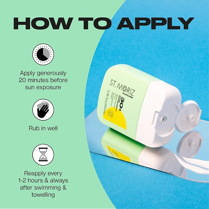 • HOW TO USE: Apply liberally 15 minutes before sun exposure. Reapply: After 80 minutes of swimming or sweating. Immediately after towel drying. At least every 2 hours.Being safe in the sun shouldn't be boring! Our daily use, broad spectrum protection formulas combine sunscreen & skincare to future-proof your skin! Use St. Moriz Suncare alongside St. Moriz Self Tan for a sun safe glow.