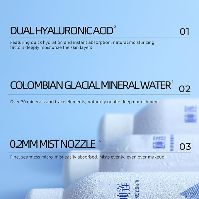• This hydrating face mist features sodium hyaluronate (hyaluronic acid) and Columbia glacier mineral water, rich in over 70 beneficial minerals and trace elements. This facial mist spray hydration formula deeply hydrates without drying the skin.