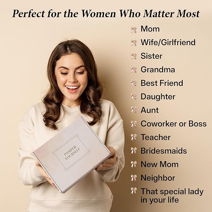 • PERFECT GIFT FOR EVERY OCCASION: Thoughtfully curated for every special moment, this spa gift box celebrates moms, grandmas, mother-in-laws, wives, sisters, teachers & best friends. Making it perfect for birthdays, mother's day, valentines, anniversaries or "just because." Offering a unique & versatile way to show appreciation. From a busy professional to a friend needing a boost, this set is a top gifts choice for women, mothers, and loved ones. It’s a delightful way to make her feel cherished.