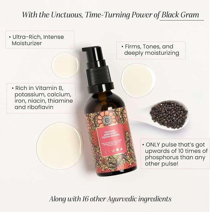• FIRMING MOISTURIZER FOR FACE, NECK AND DECOLLETE: Smooth the look of wrinkles, fine lines, sagginess and other signs of aging, and get firmer, youthful skin. Yauvari Oil is made with protein-rich Black Gram that is known for its unctuous nature and toning action. It has over 16 Ayurvedic ingredients including Turmeric, Vetiver and Vitamin-rich Oils that leave you with youthful radiance.