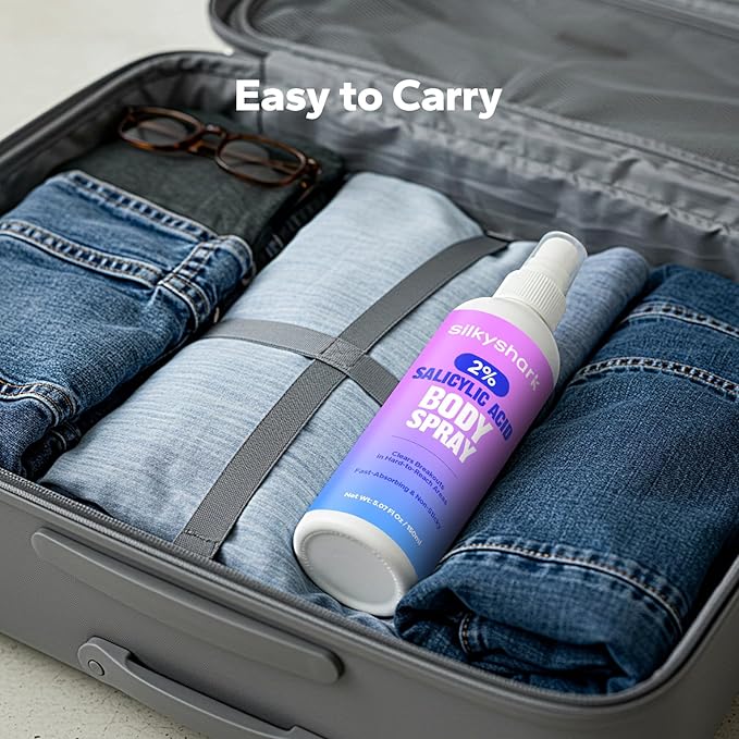 • Target Stubborn Breakouts: Formulated with 2% Salicylic Acid, SilkyShark Salicylic Acid Spray helps penetrate deep into pores to exfoliate dead skin cells and reduce pore congestion—supporting the reduction of breakouts at the source. Whether you're dealing with blemishes on your chest, back, or shoulders, this lightweight formula is designed to work on problem areas without over-drying. With regular use, it supports a visibly smoother texture and a more balanced-looking complexion.