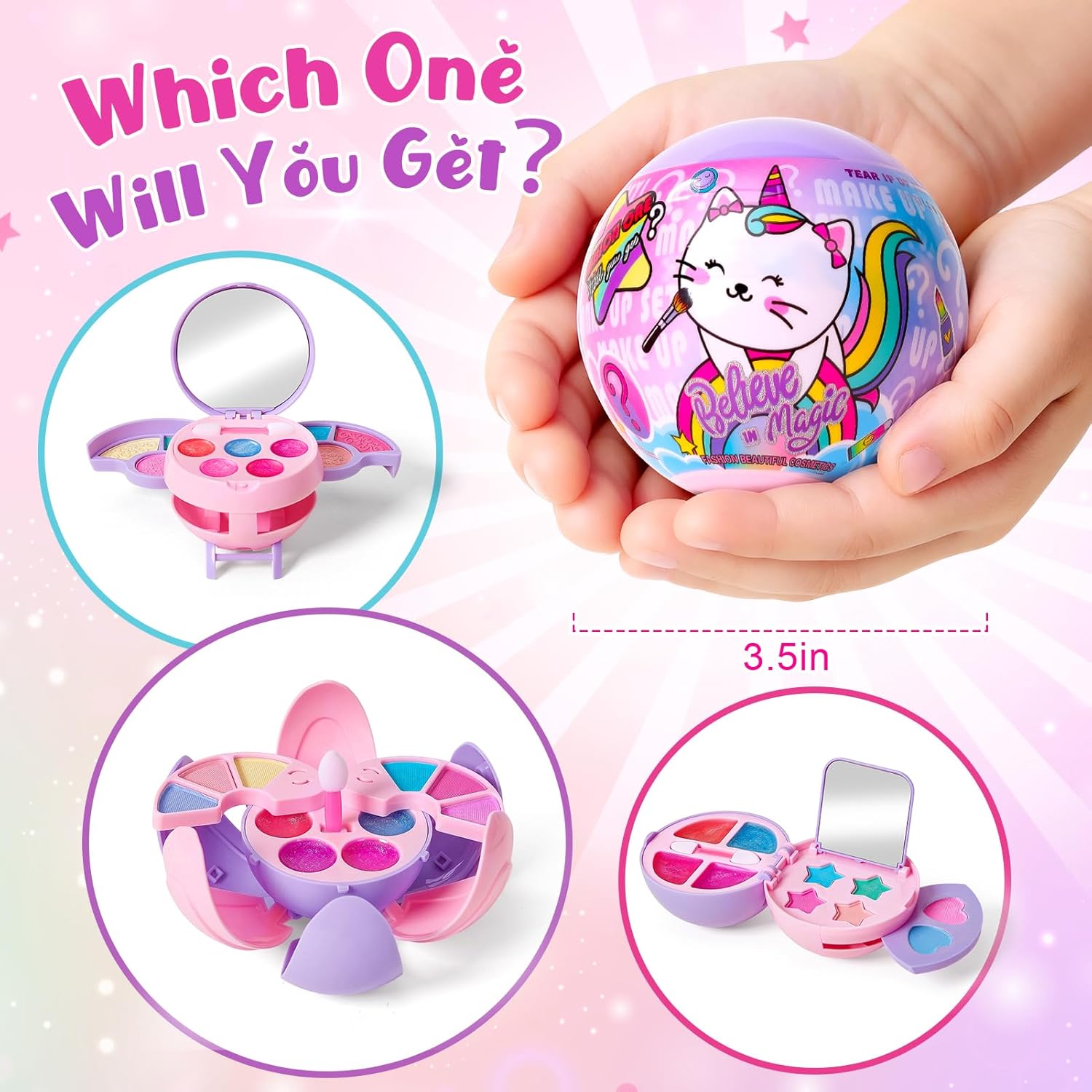• 3 Distinct Styles to Discover: Each ball contains 1 of 3 different mini kids makeup sets. Open a randomly picked makeup blind ball and you will get: 6 colors of eye shadow, 4-5 colors of lip gloss for girls, a tiny sponge blusher, and a small mirror for portable touch-ups (2 models equipped). Find out which one you will get and enjoy the surprise fun