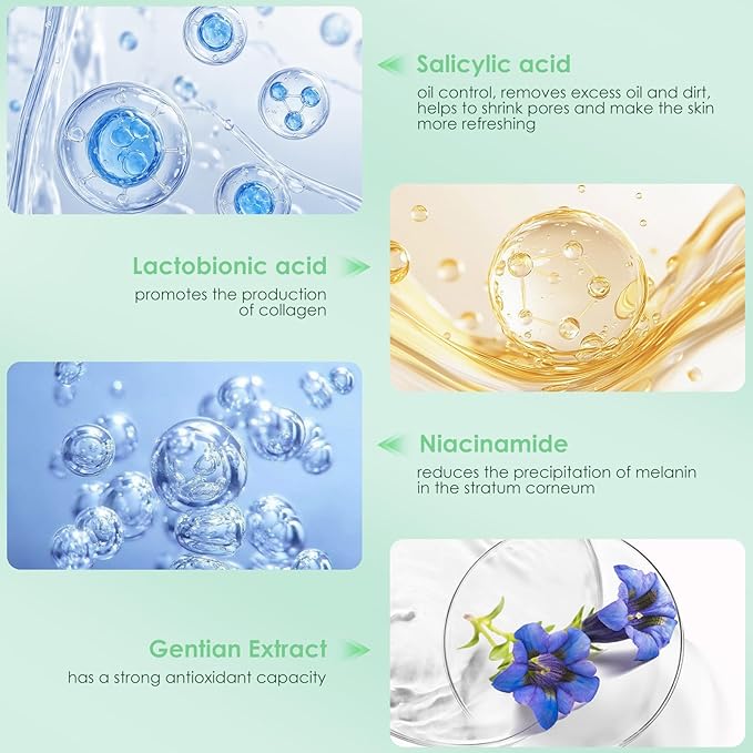 • Skin-Friendly Ingredients: Salicylic acid controls oil, removes excess oil, while lactobionic acid promotes collagen production, reduces melanin deposition, and provides antioxidant benefits